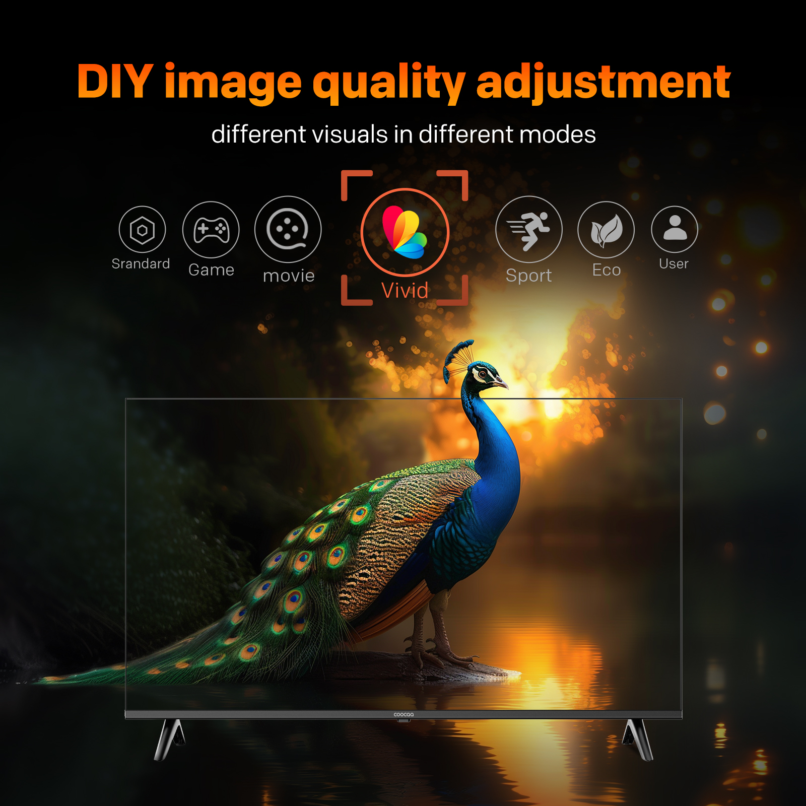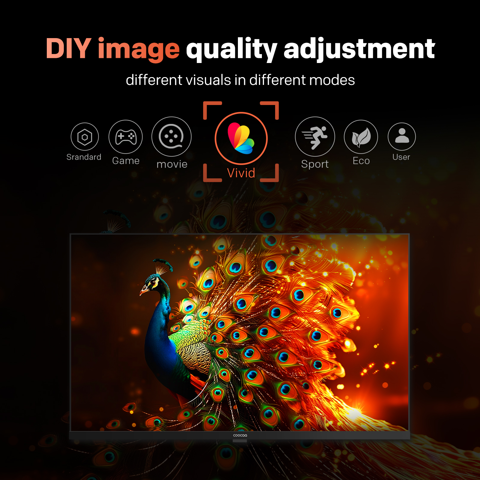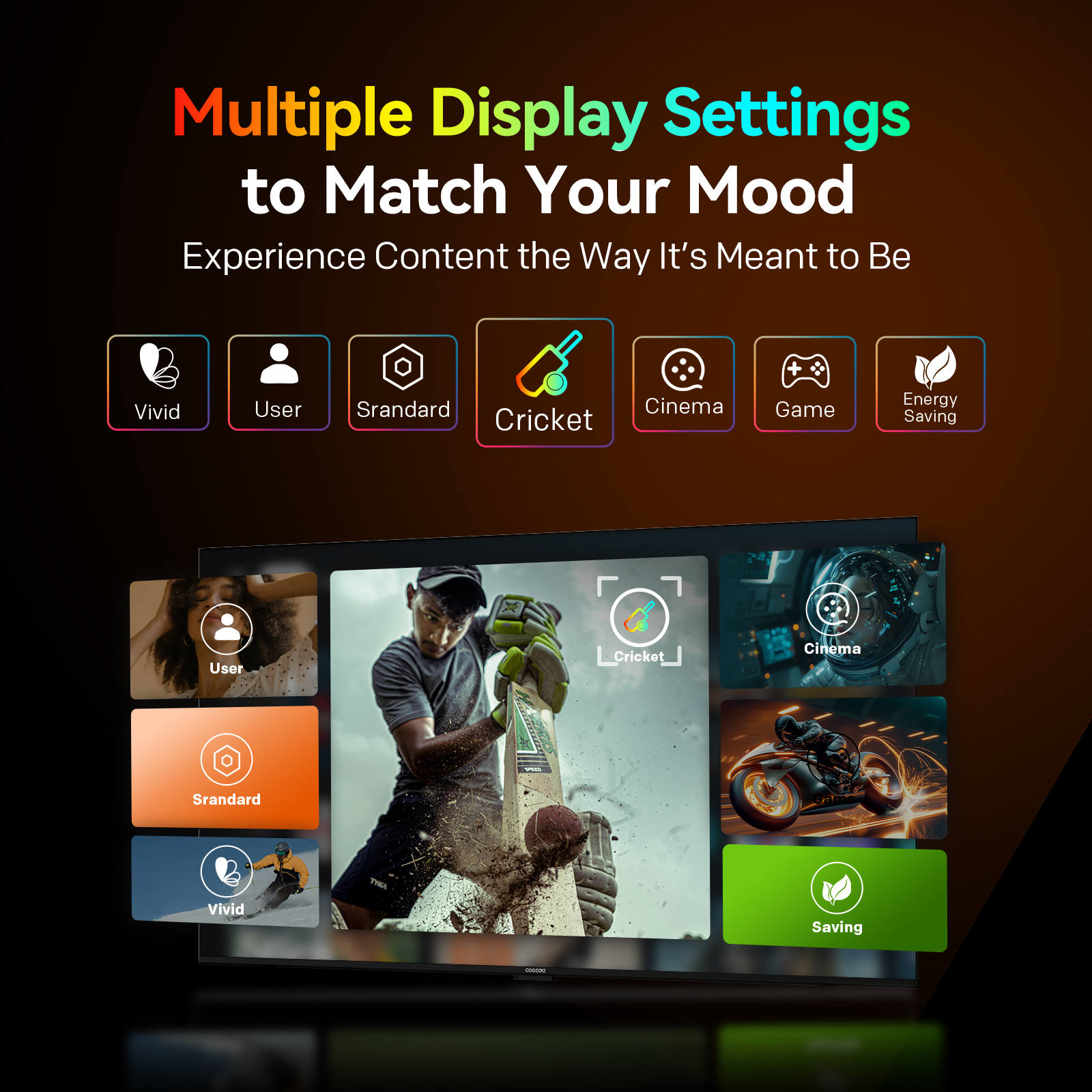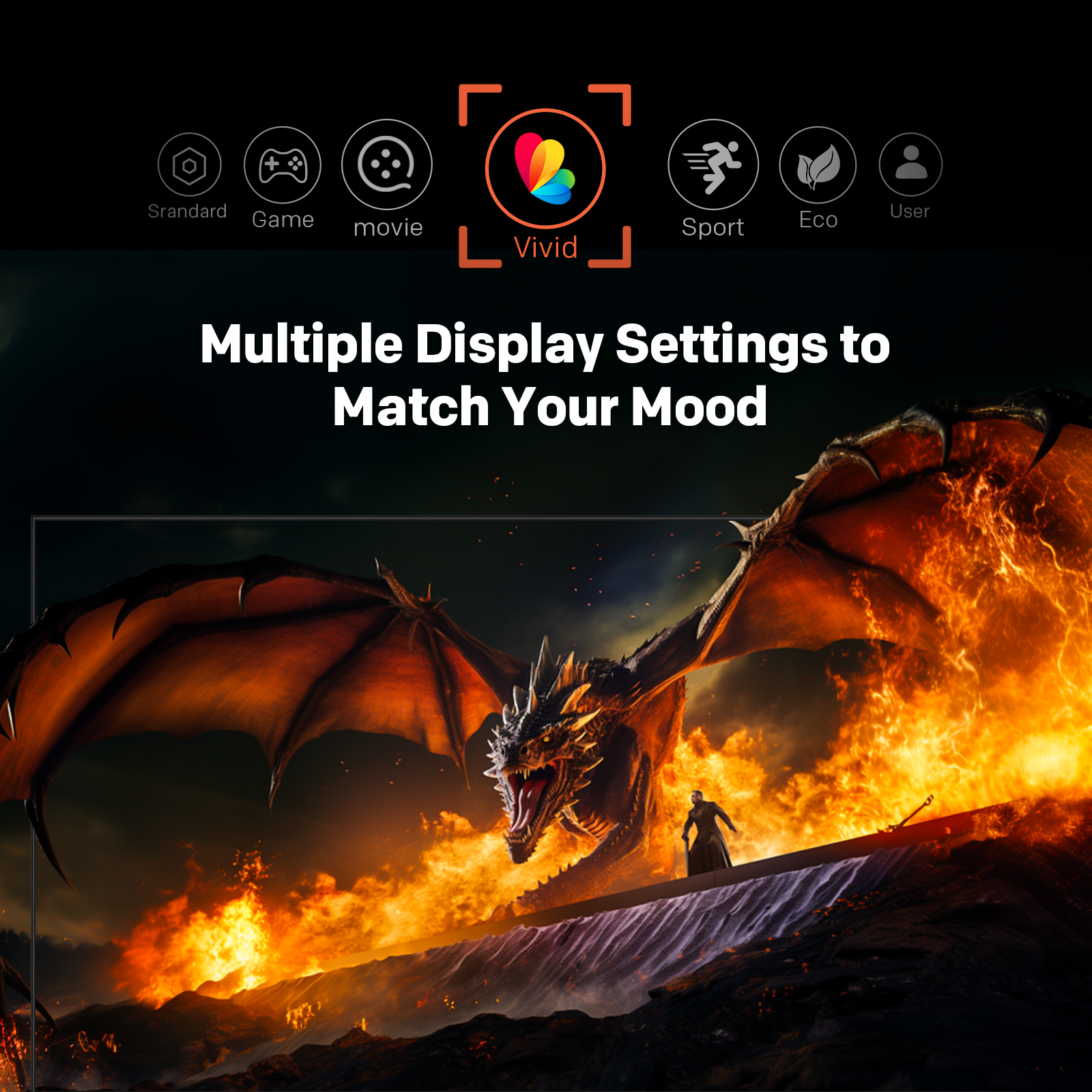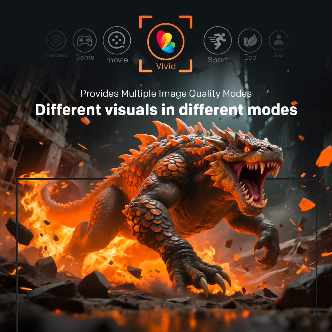"copy": "Customize your visuals just the way you like them! With multiple picture modes including Standard, Game, Movie, Vivid, Sport, Eco, and User, your screen always adapts to your viewing mood.",