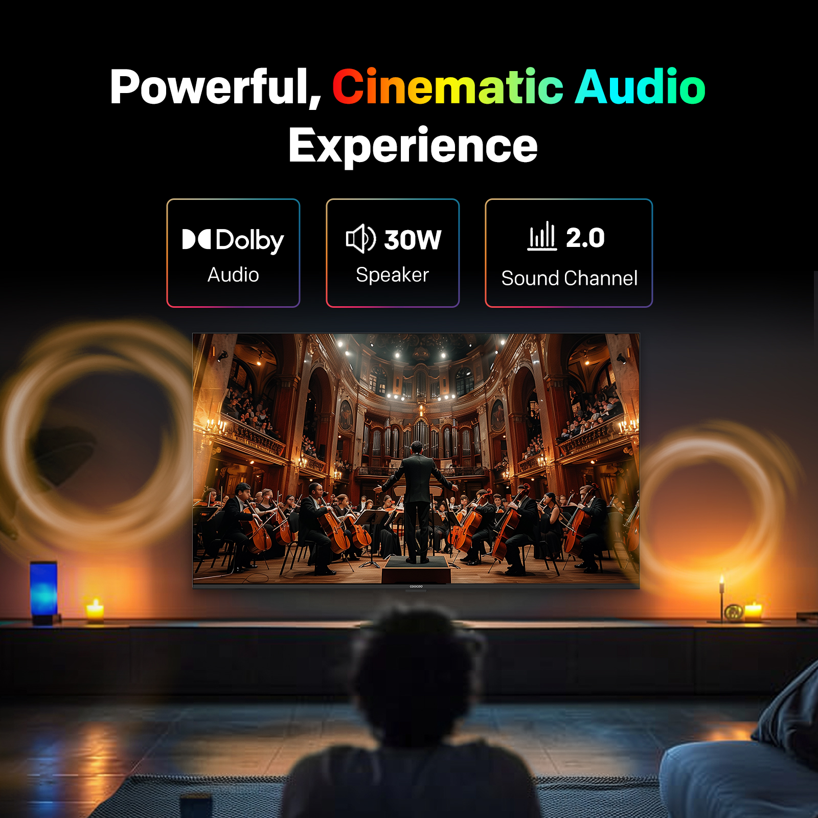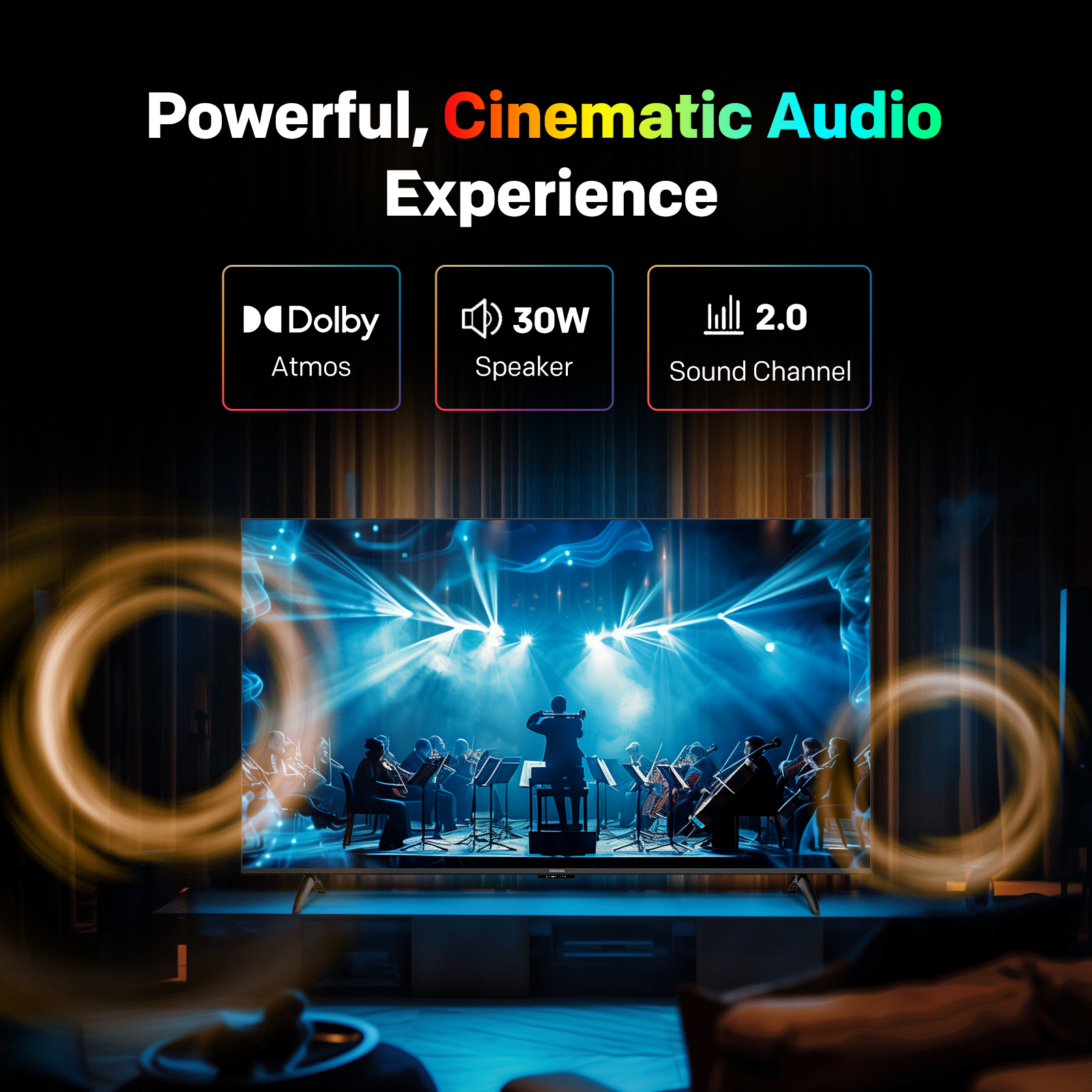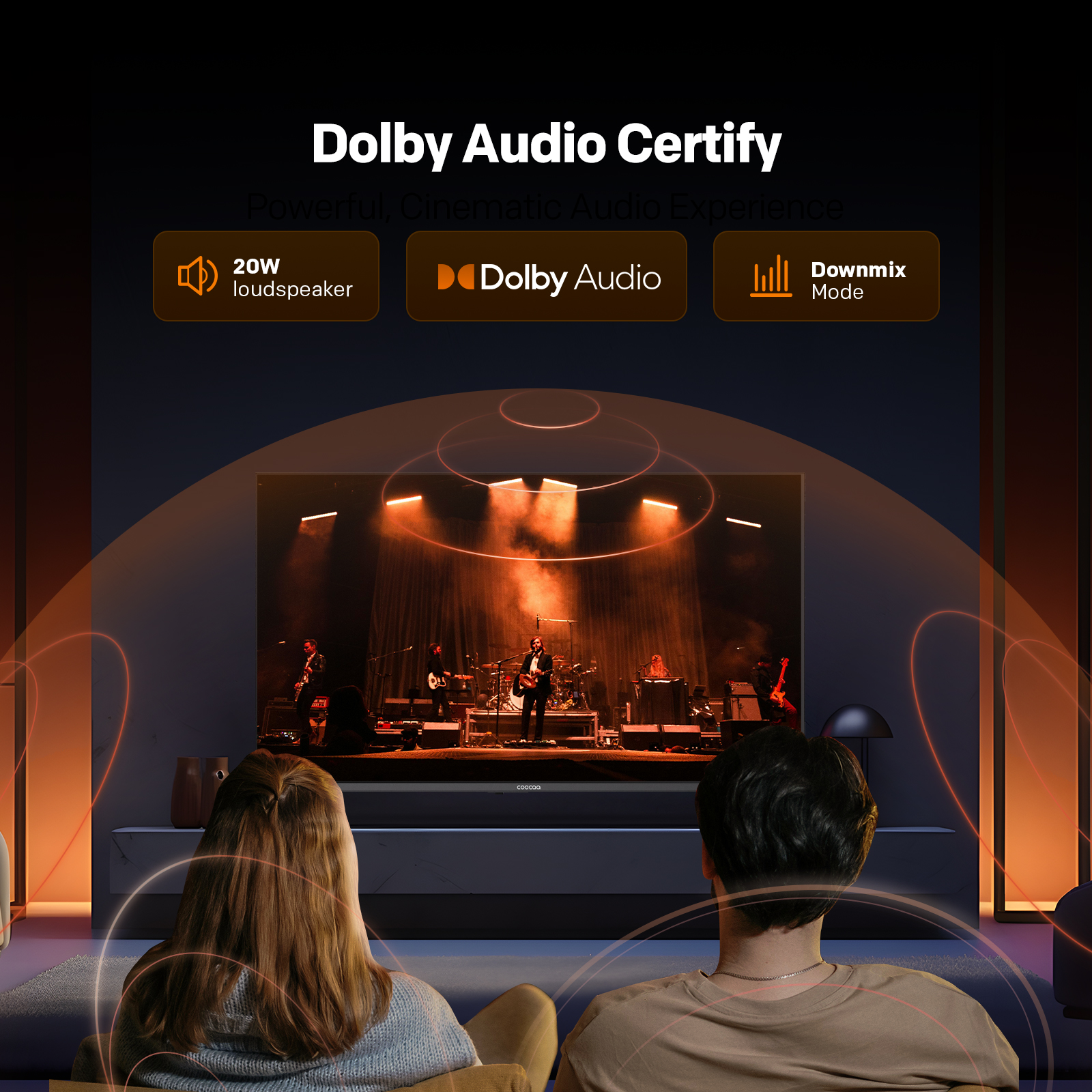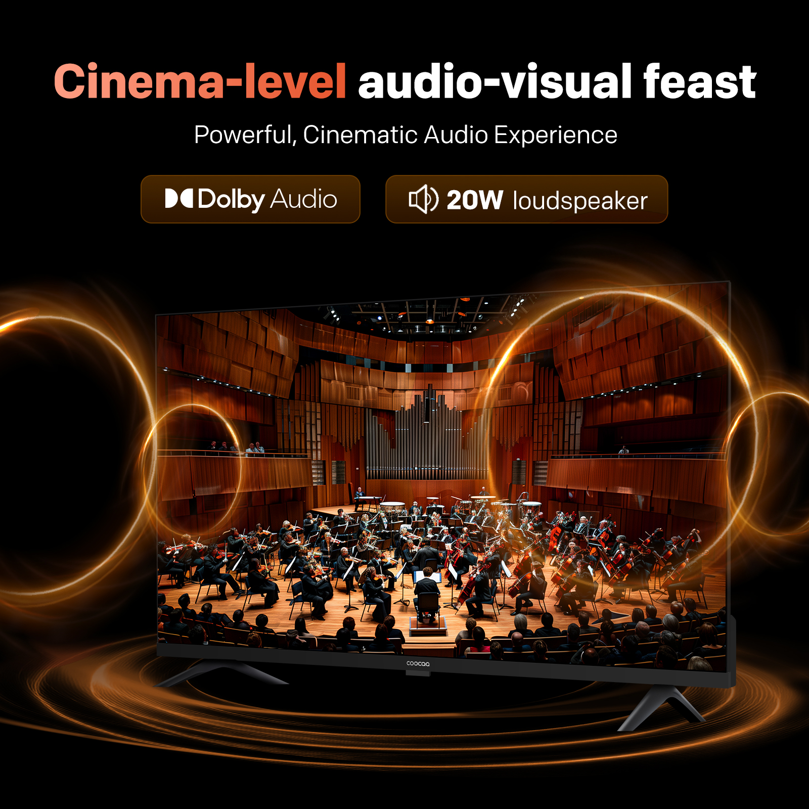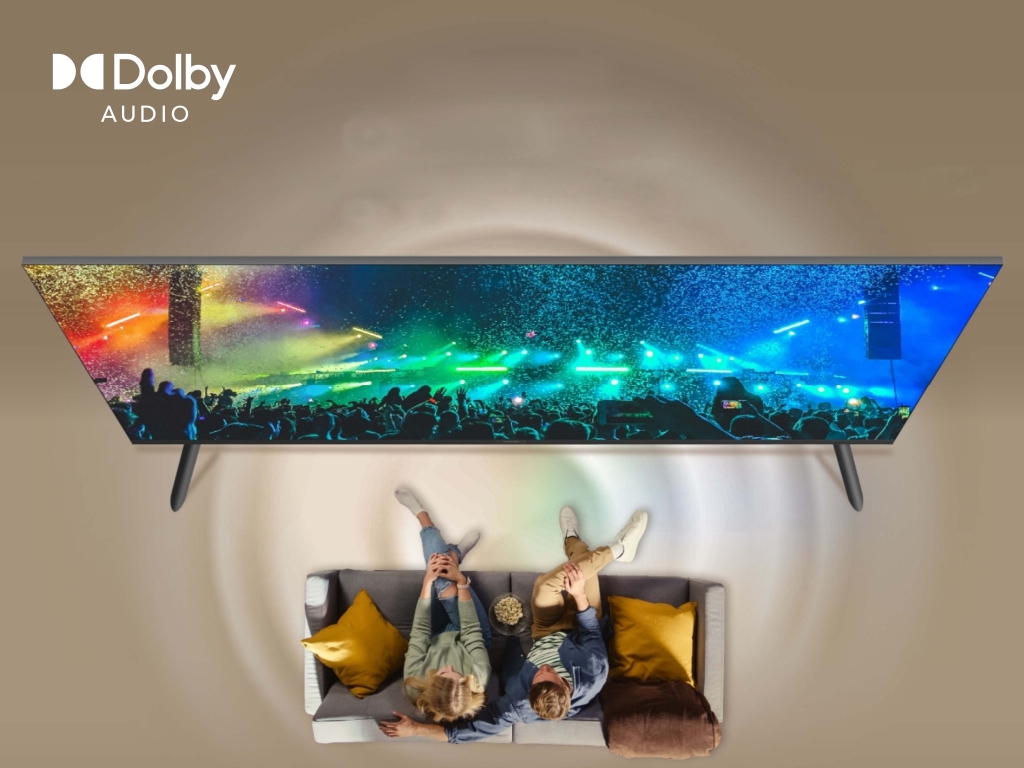 "copy": "Turn your living room into a mini-theatre! Equipped with Dolby Audio and 20W loudspeakers, this TV delivers powerful, cinematic sound that pulls you right into the action",