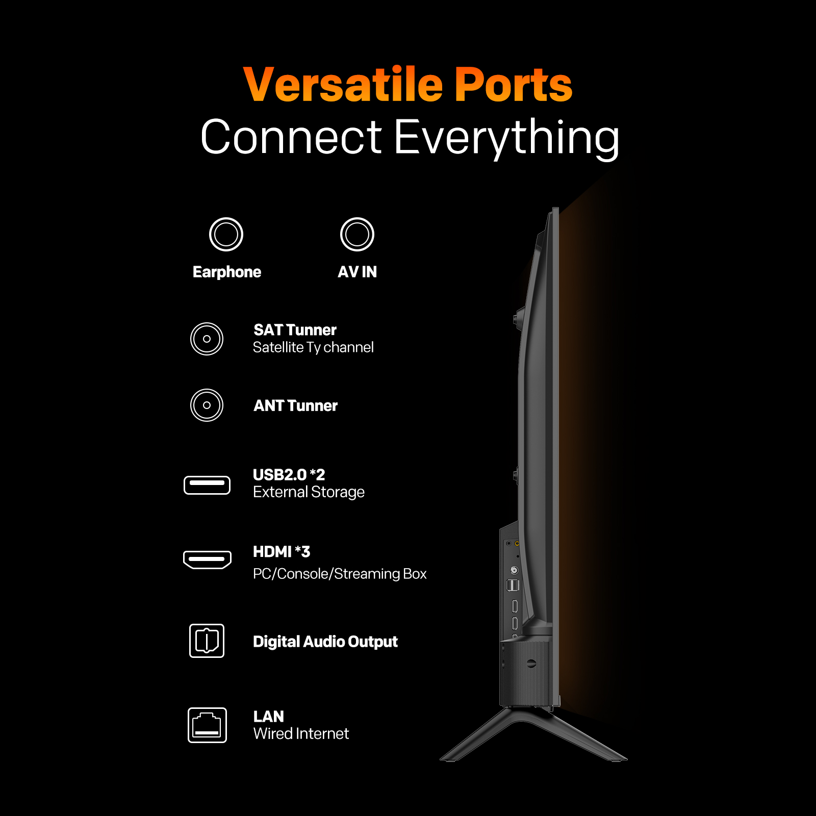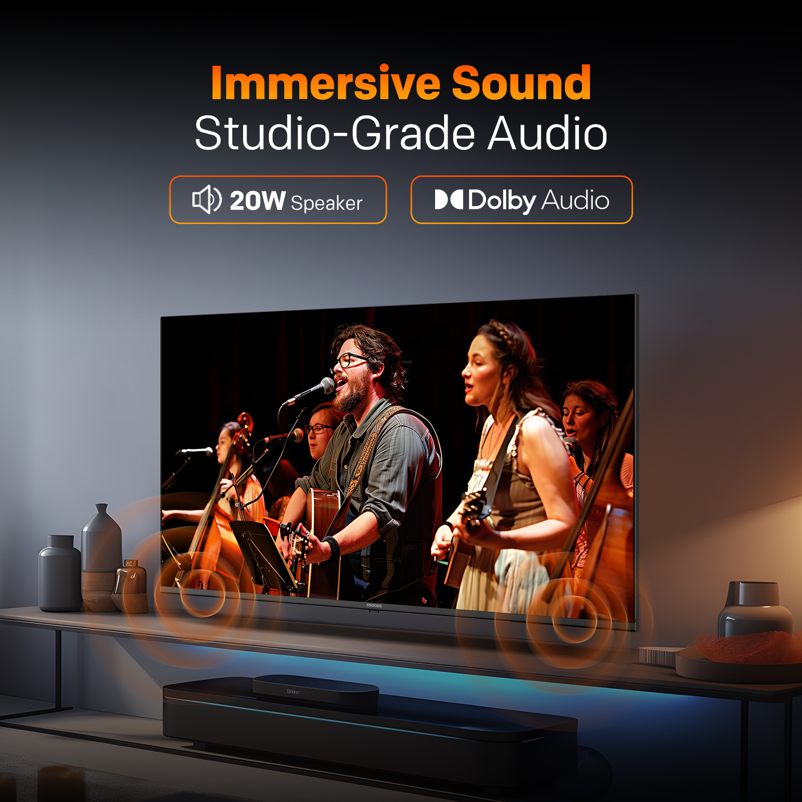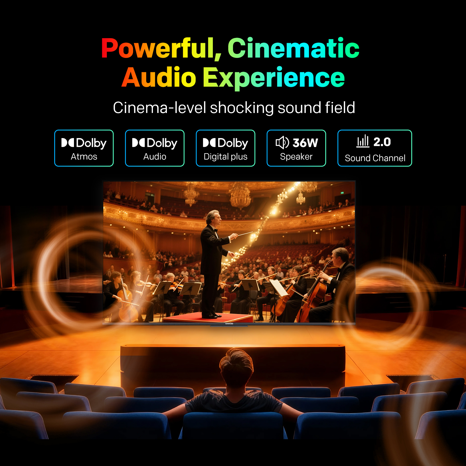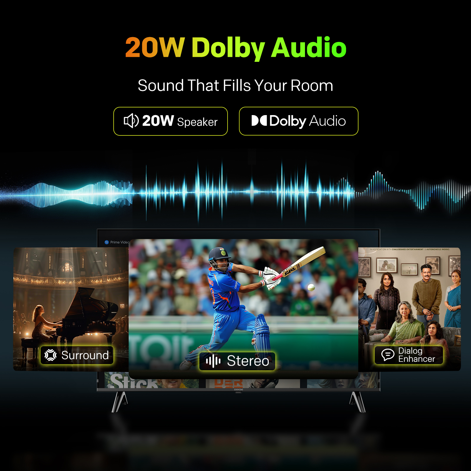 "copy": "Turn your living room into a mini-theatre! Equipped with Dolby Audio and 20W loudspeakers, this TV delivers powerful, cinematic sound that pulls you right into the action",