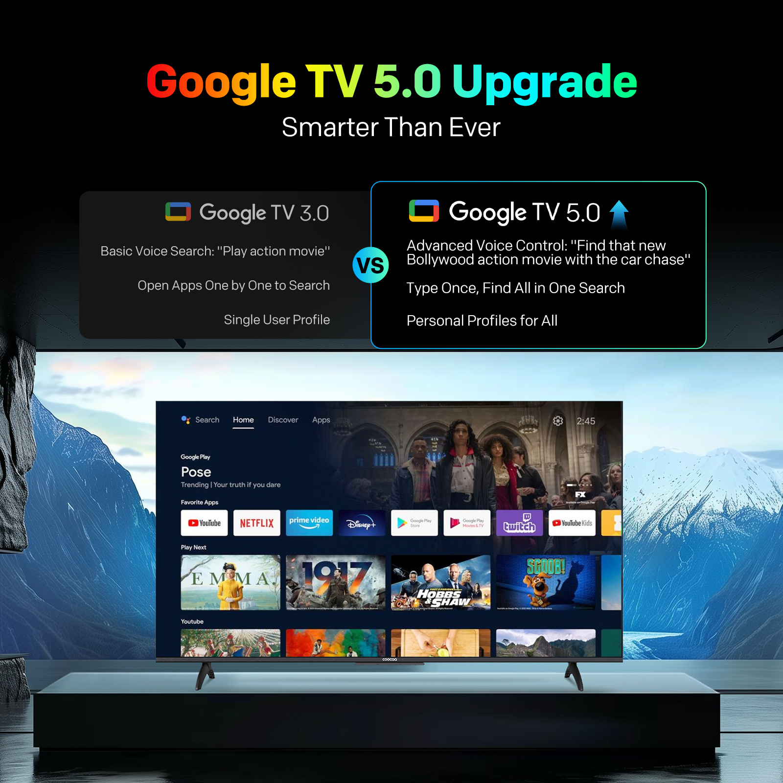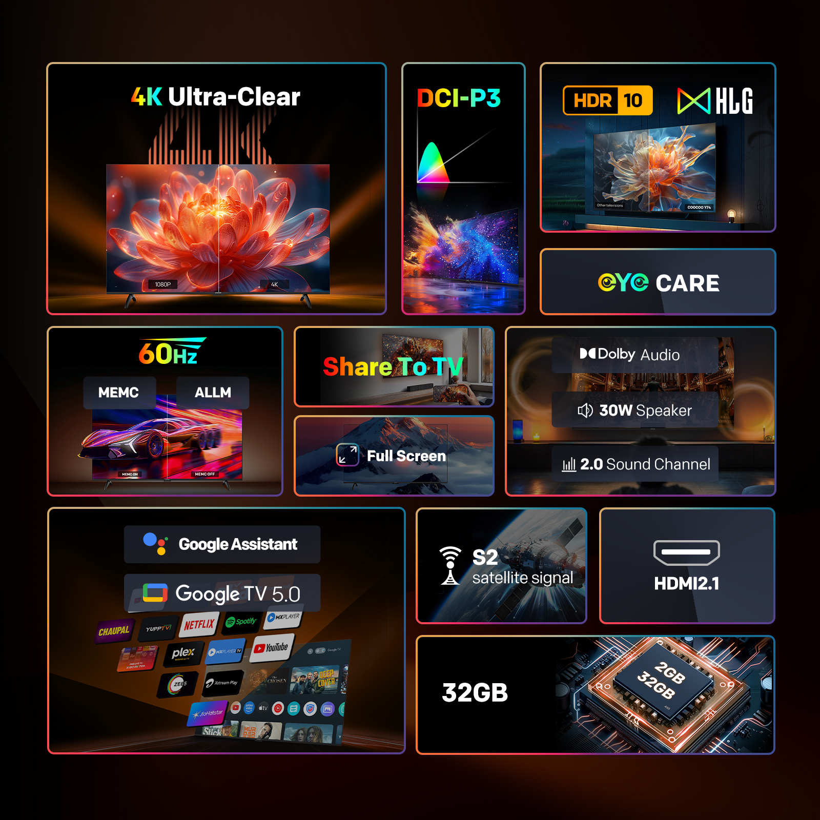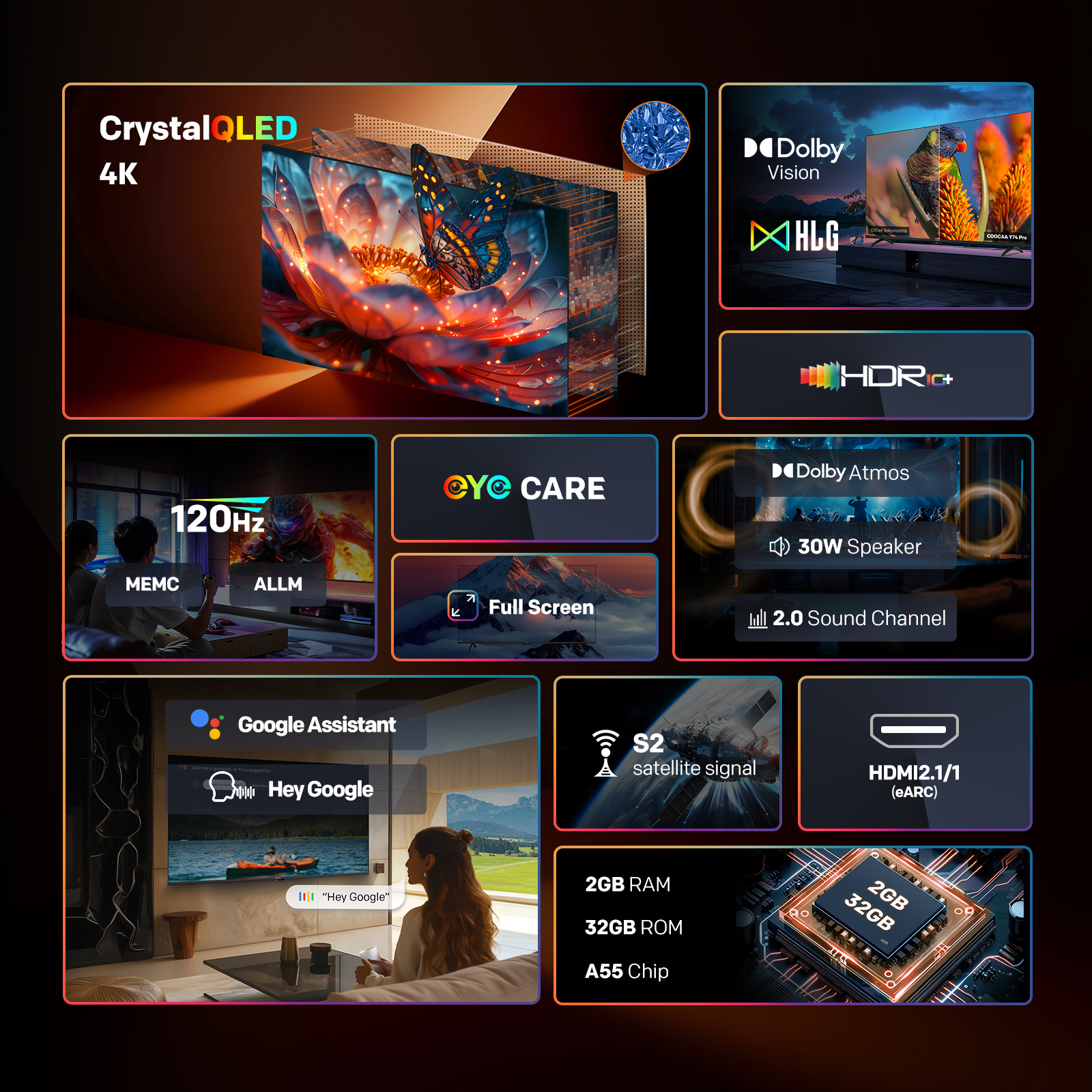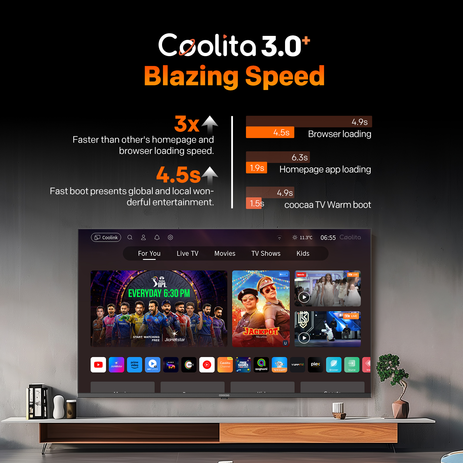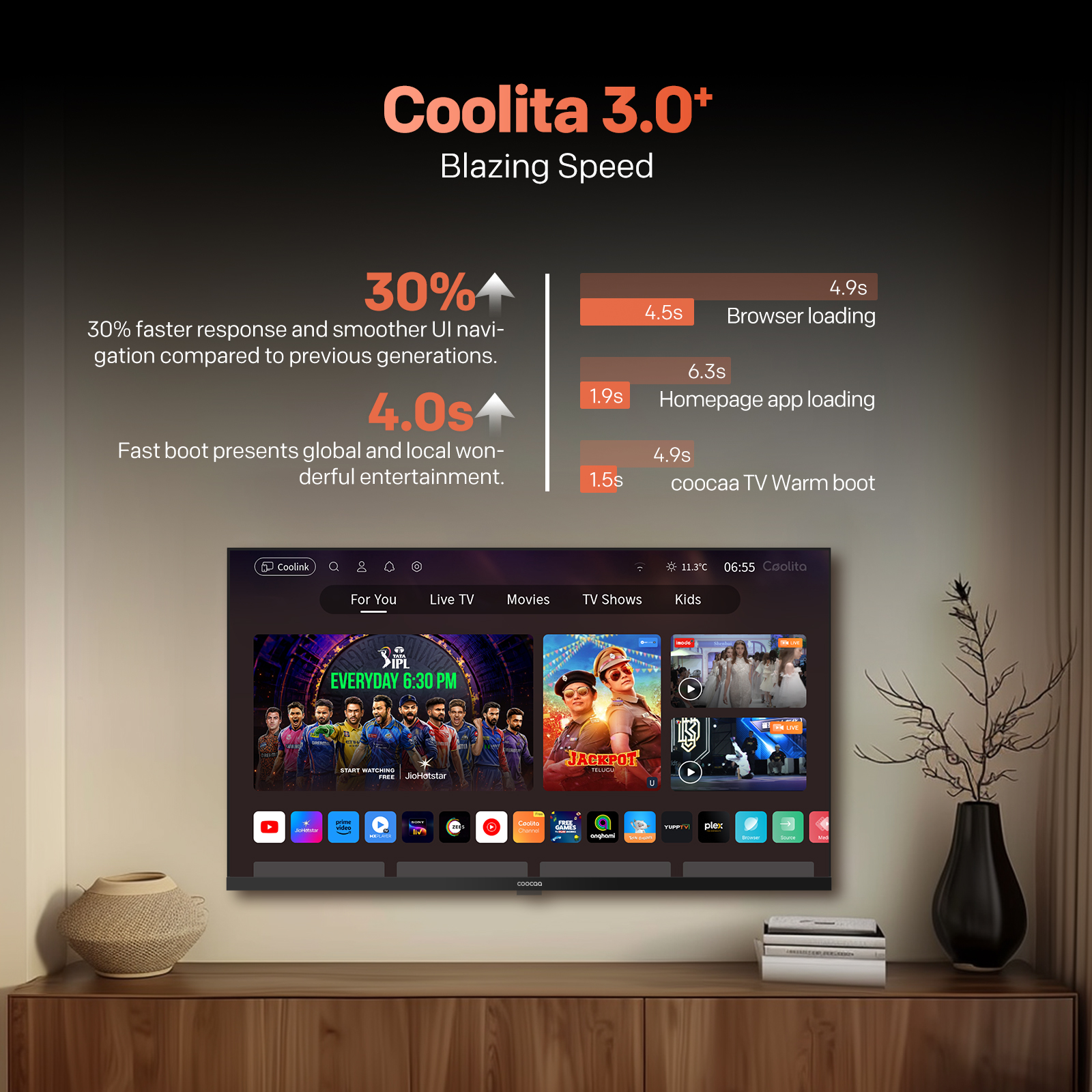 "copy": "Say goodbye to lags and hello to speed! Powered by Coolita 3.0+, this TV offers 30% faster UI navigation, quick app loading, and a lightning-fast 4-second boot-up for a seamless entertainment experience",