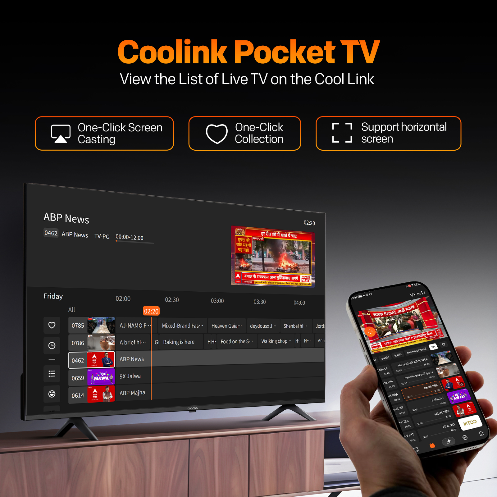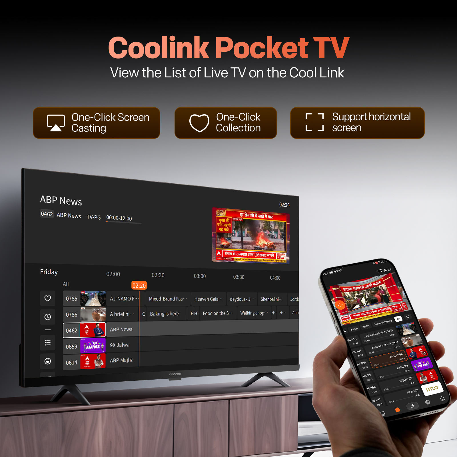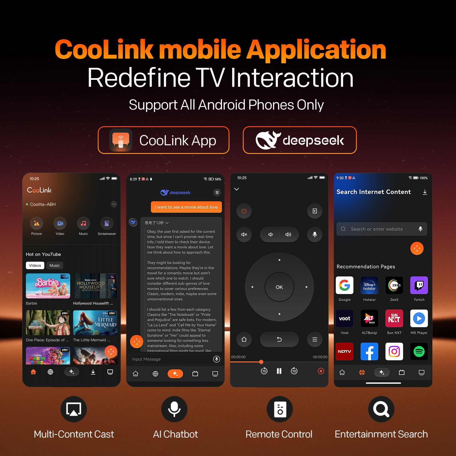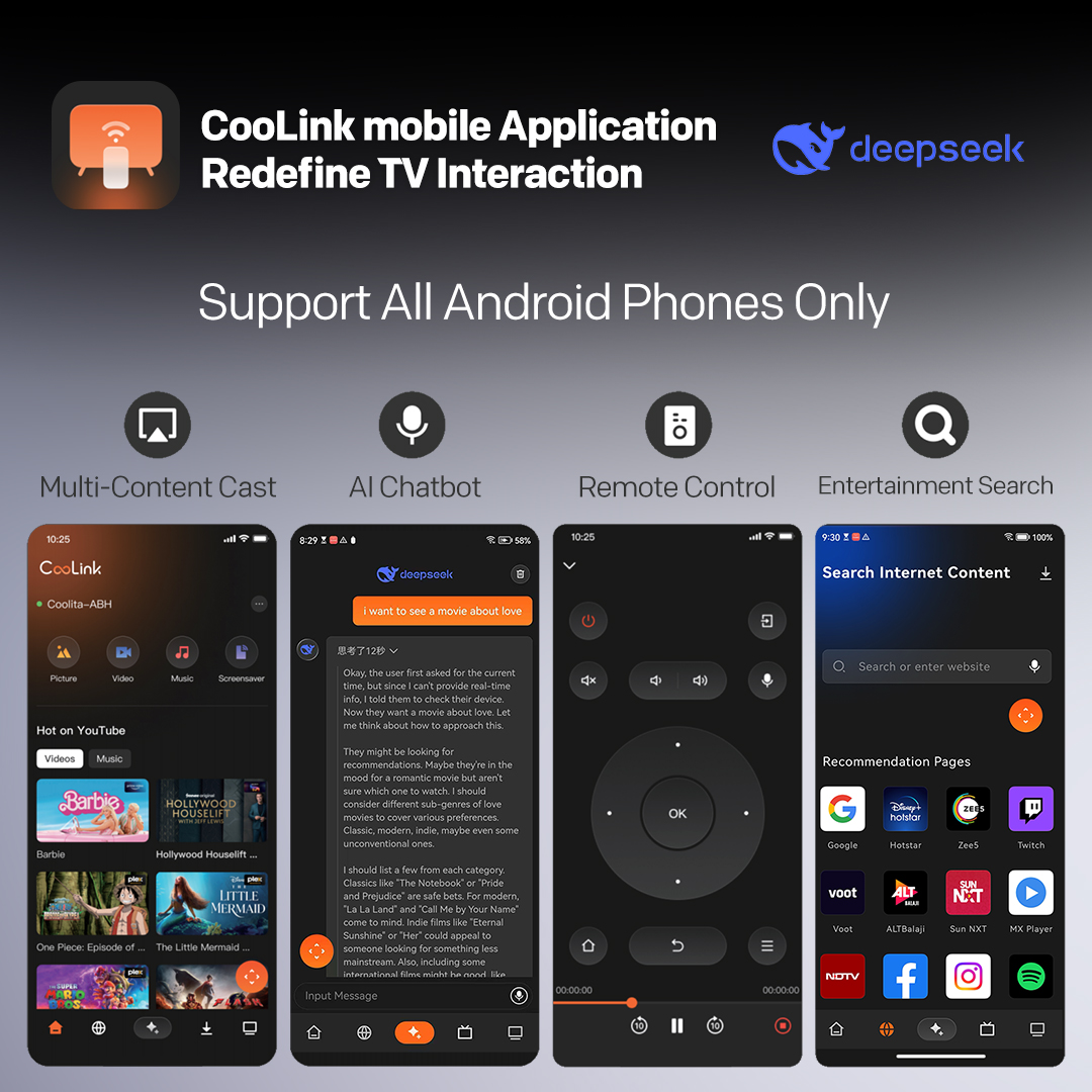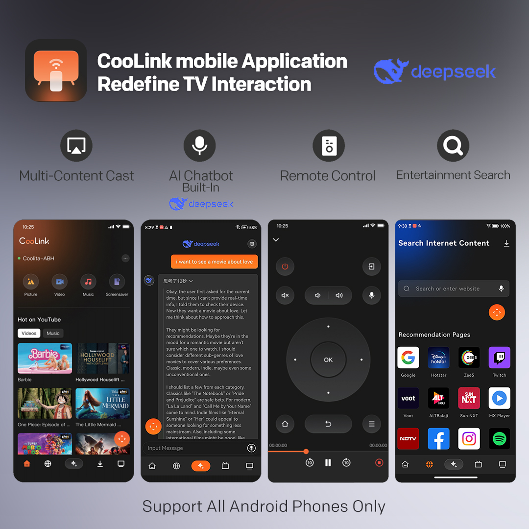 "copy": "Control your entertainment right from your phone with the Coolink app (Android), turning it into a powerful smart remote. Cast content, discover shows via AI Chatbot, and browse live channels with Pocket TV for on-the-go convenience.",