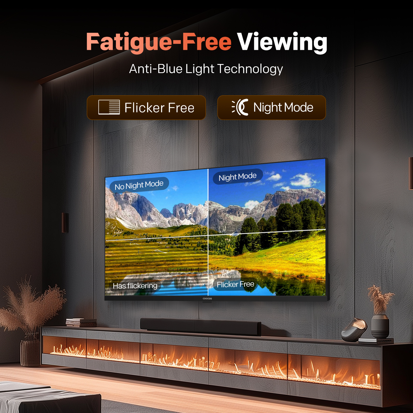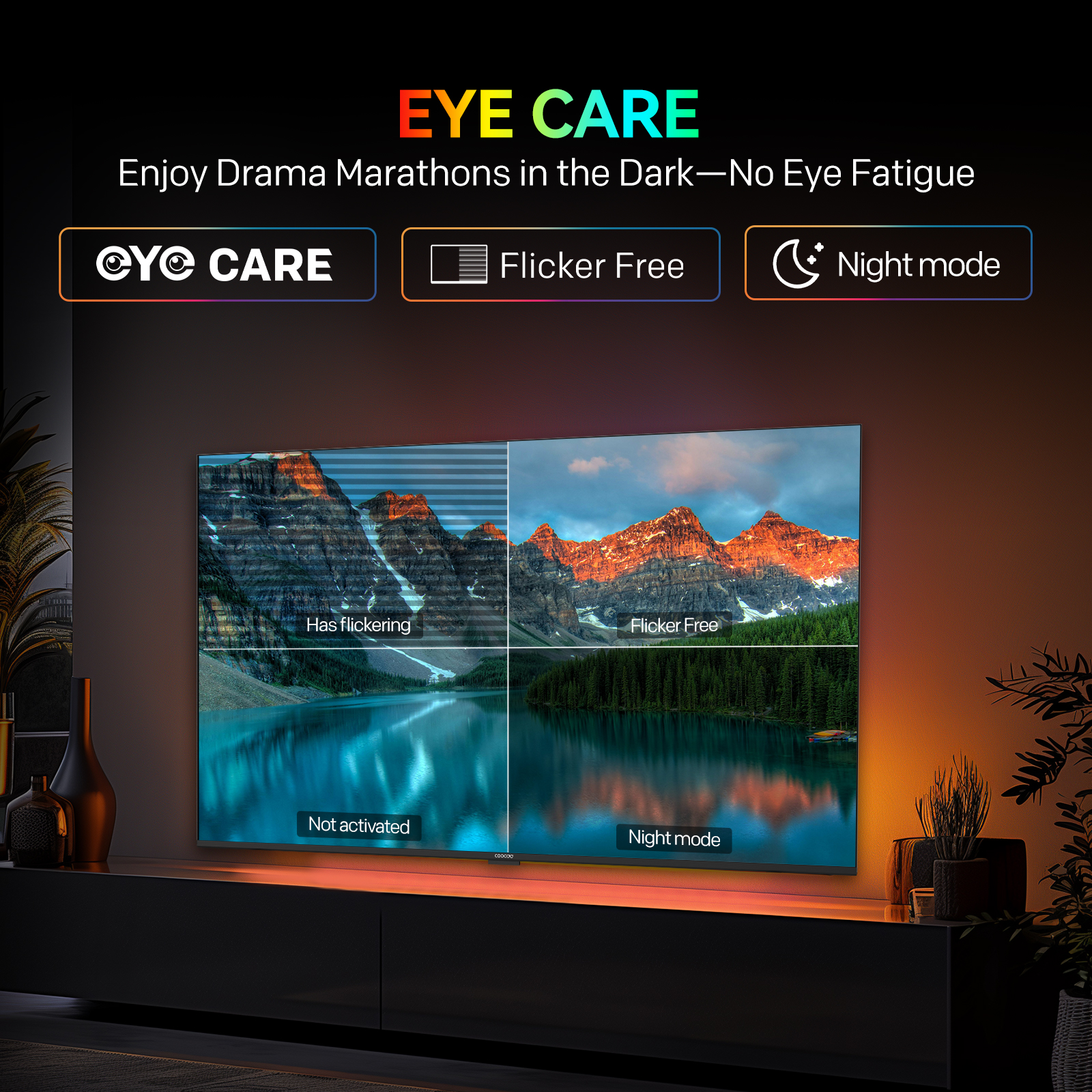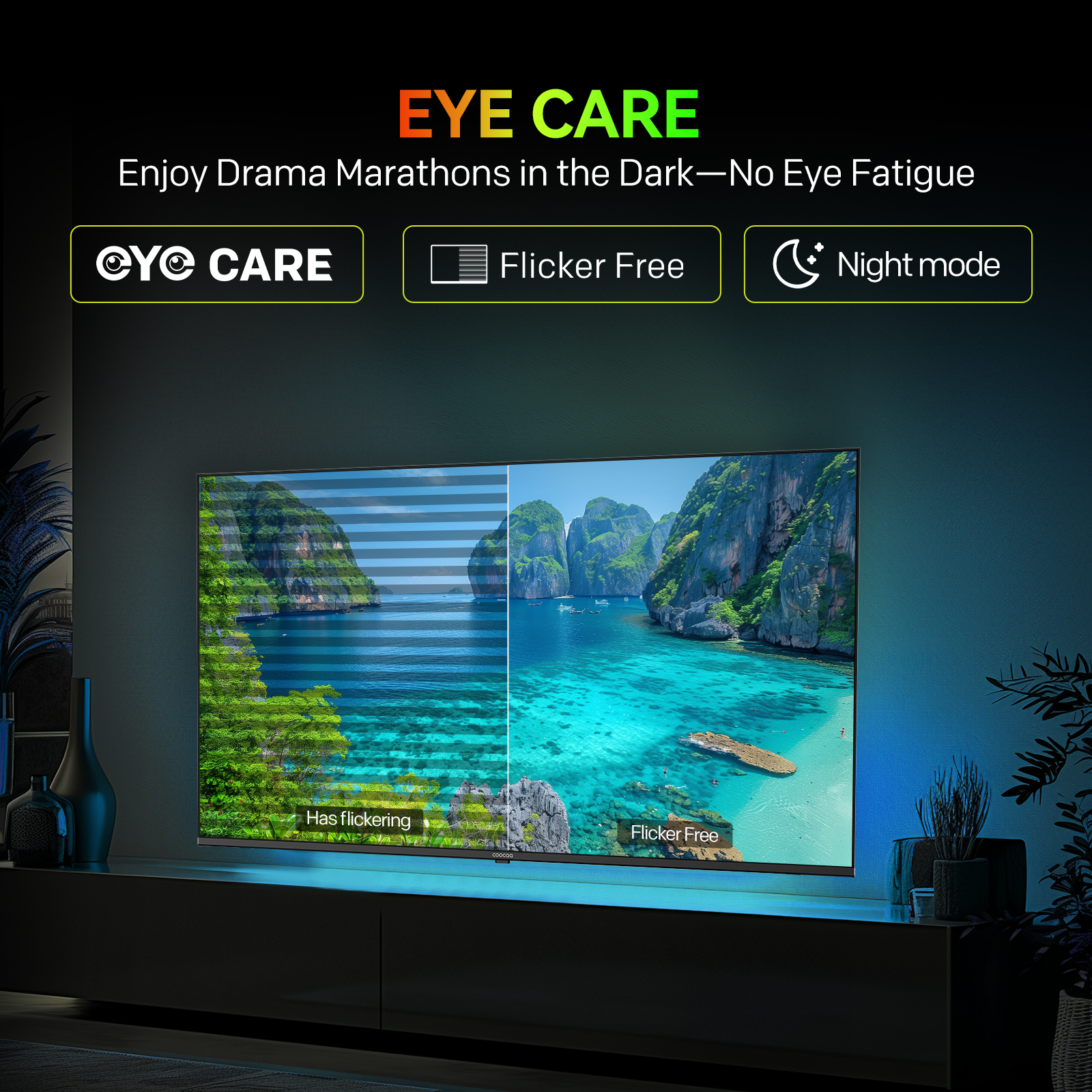 "copy": "Enjoy long hours of entertainment without straining your eyes. With Anti-Blue Light Technology, Night Mode, and Flicker-Free display, you get a comfortable, fatigue-free viewing experience any time of the day.",