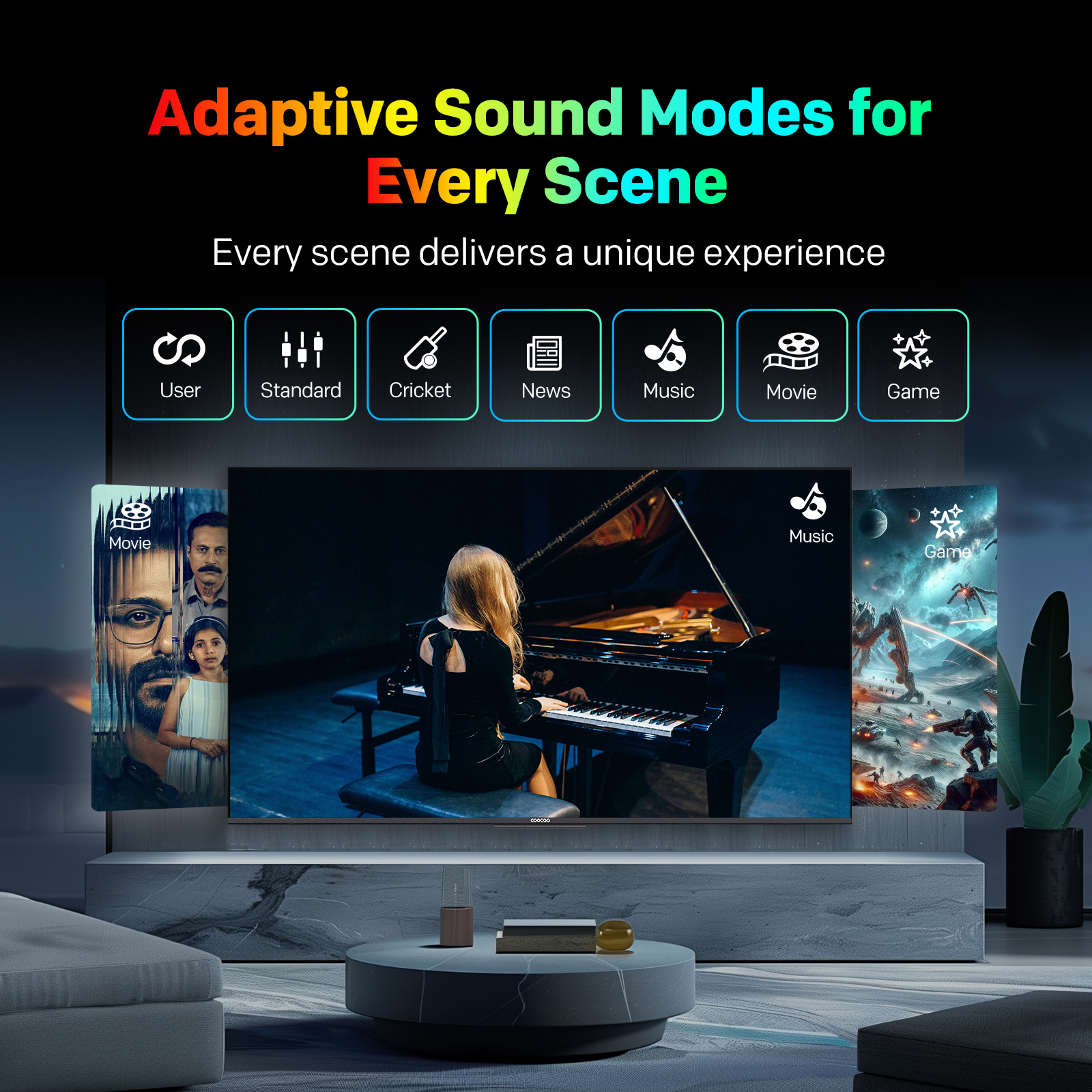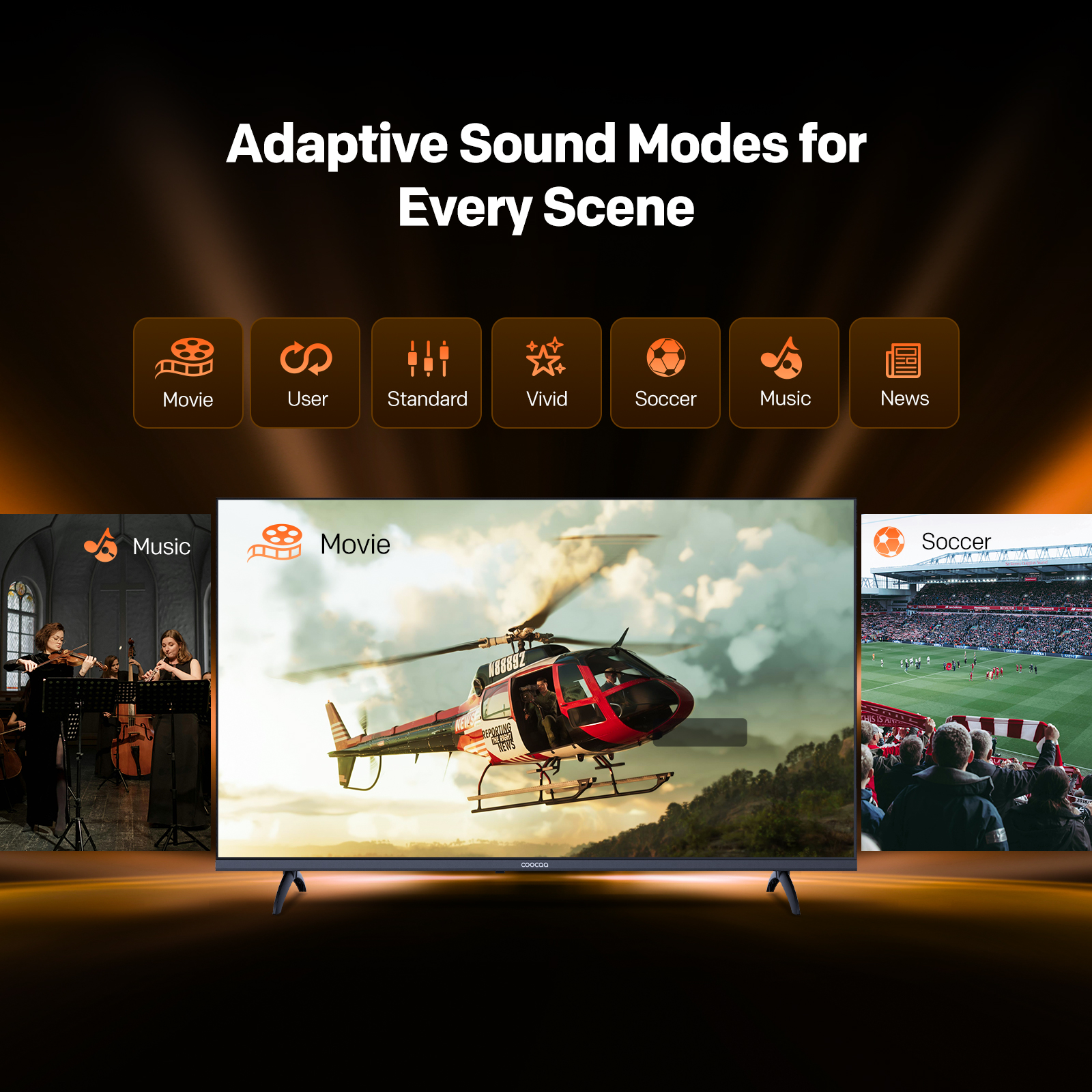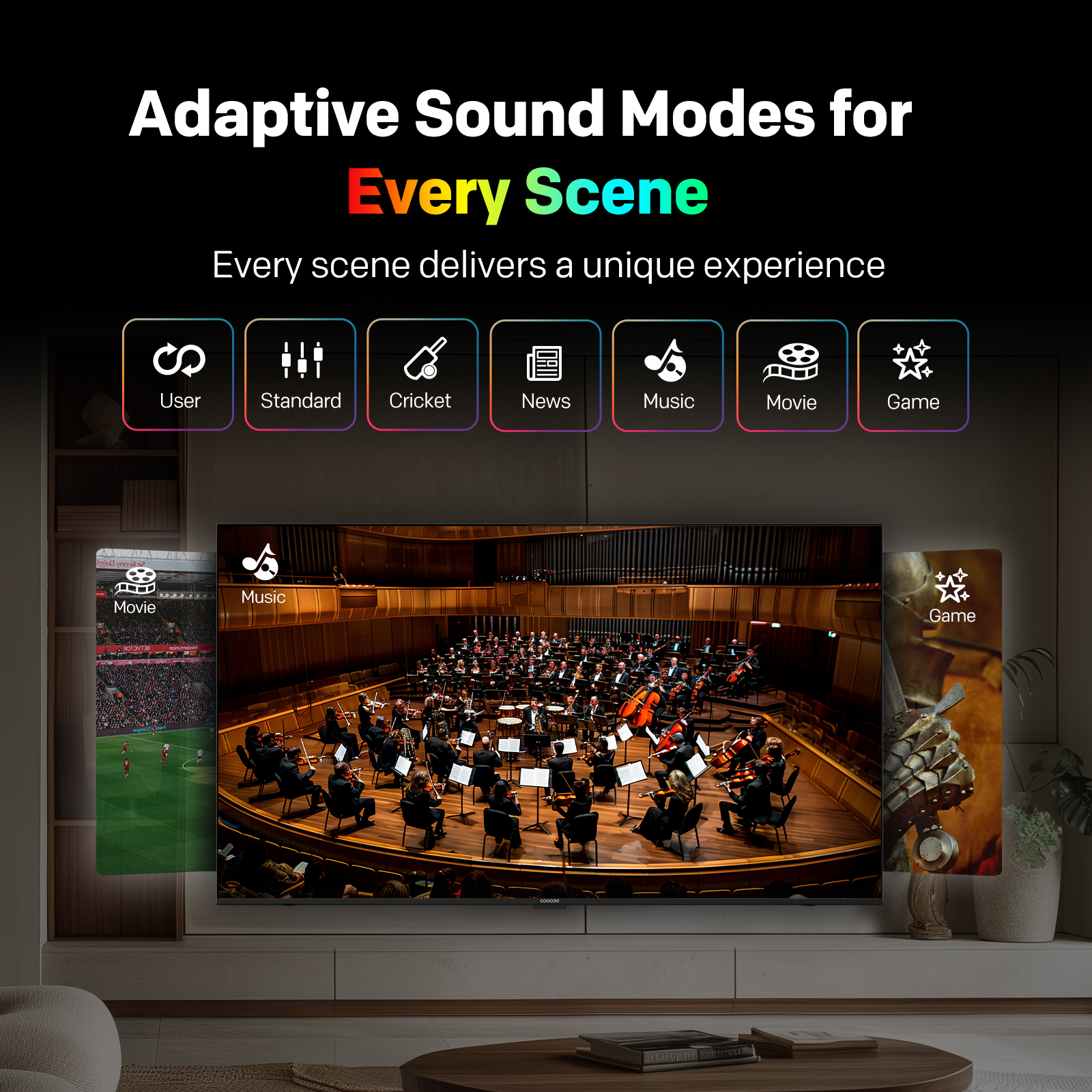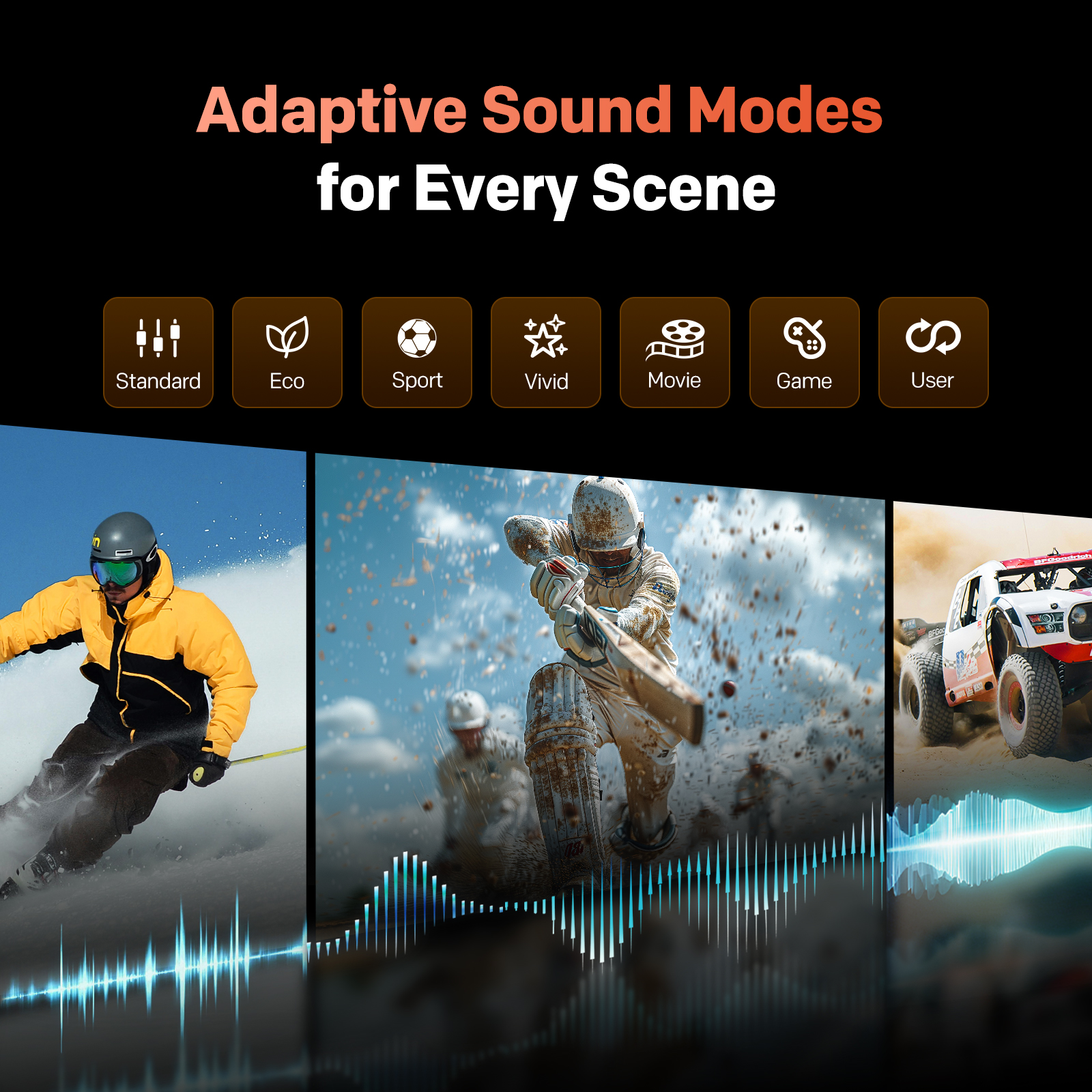 "copy": "No matter what you’re watching – sports, movies, gaming, or casual TV – enjoy optimized audio with Adaptive Sound Modes. Choose from Standard, Eco, Sport, Vivid, Movie, Game, or User to suit your scene.",