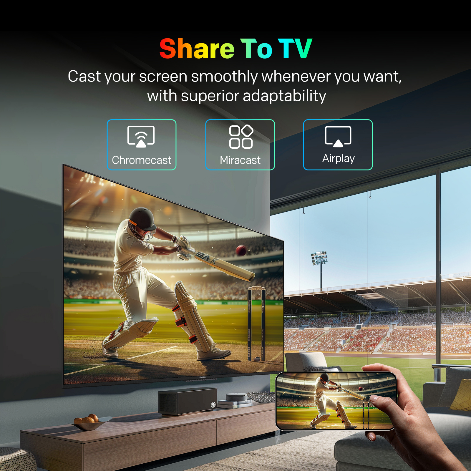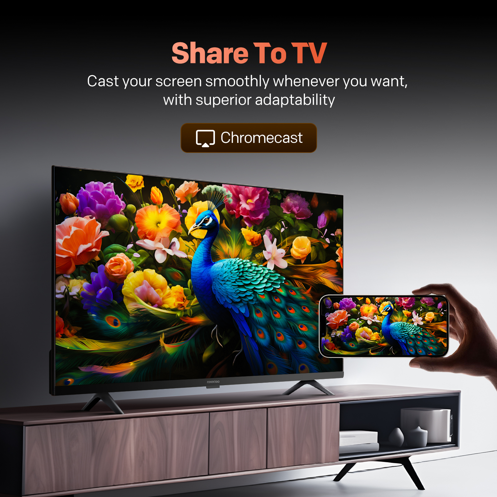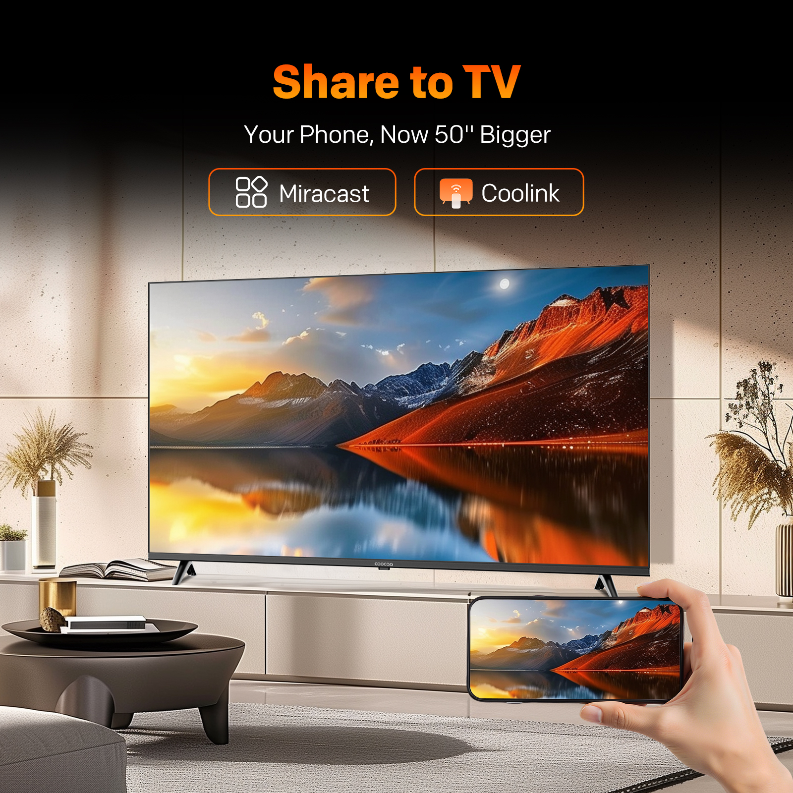 "copy": "Coocaa's CC Cast lets you effortlessly mirror content from your phone to your TV in a lightning-fast 0.5 seconds. Simply connect and enjoy your favourite shows, movies or games on the big screen without any hassle.",