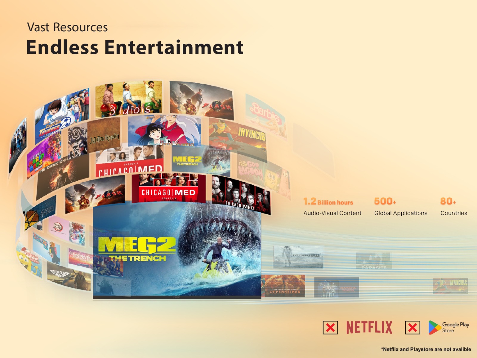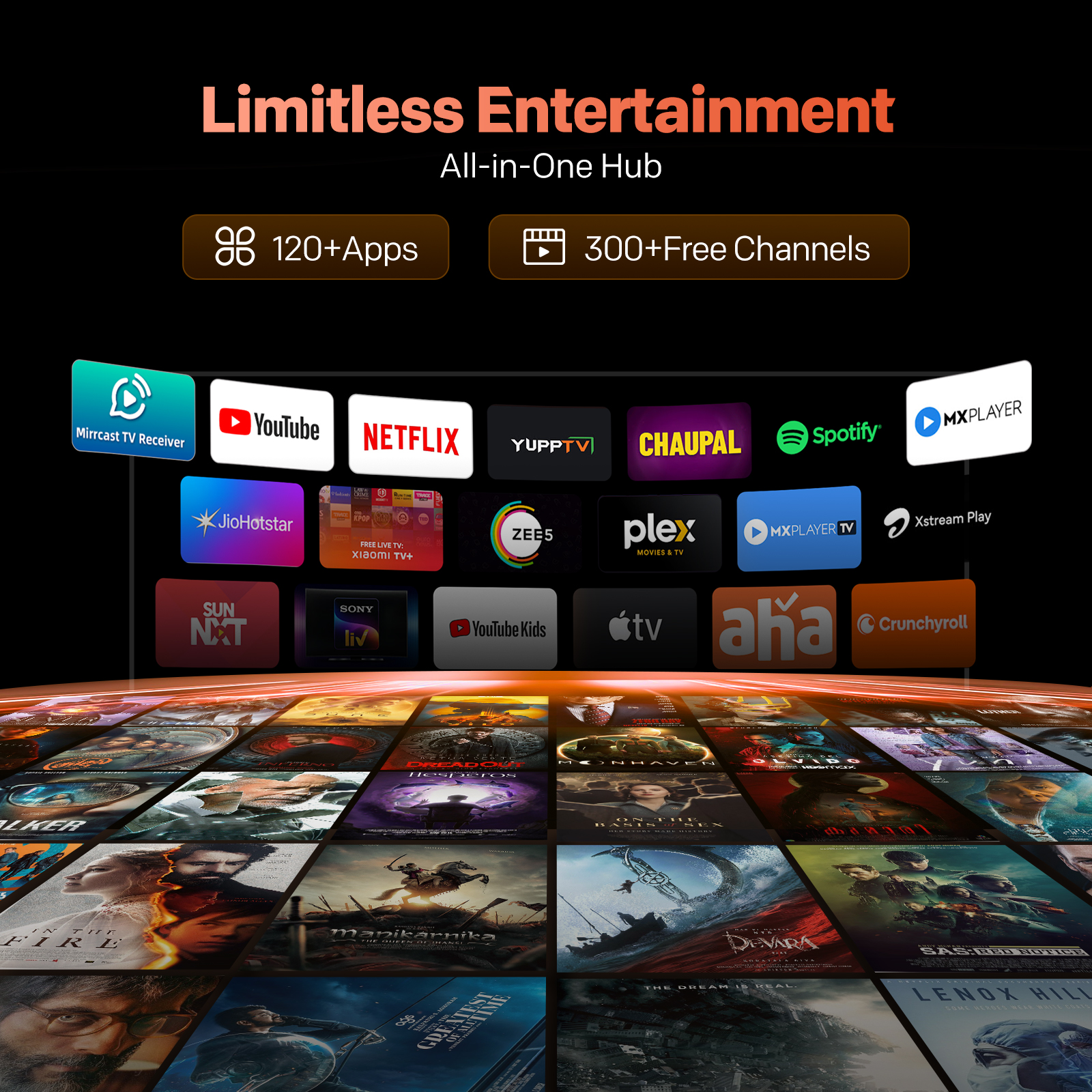 "copy": "Dive into a world of entertainment with 120+ apps and 300+ free channels. From Netflix blockbusters to YouTube trends, your next binge is just a click away—plus smart recommendations tailored for you.",